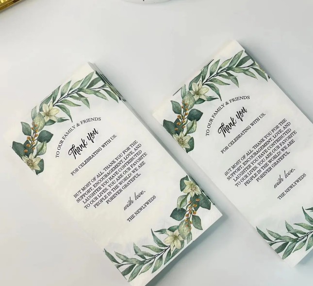 Ať už se jedná o narozeninovou oslavu, tematická svatba nebo událost firemního značky, vlastní tištěné tkáně dokonale doplňují téma a barevné schéma akce. Představte si vynikající nastavení stolu, každé tkáně potištěné logem páru, firemního sloganu nebo slavnostním motivem - tento druh promyšlené pozornosti k detailům okamžitě ukazuje závazek organizátora k kvalitě. To poskytuje nejen pohodlí pro hosty, ale také jemně posiluje téma akce.